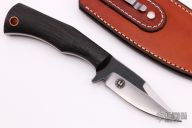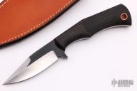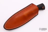 This Personal Fighter by Chris Taylor features a hollow ground blade with satin finished grinds and dark flats.  .225" Blade Stock.  1.15" Blade Depth.  The handle features a full tang construction, stabilized bog oak scales over micarta liners and a copper lined lanyard hole.  Includes a brown leather sheath and COA.  New From Maker.