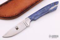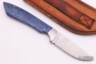 This hunter by Ron Jamieson features a satin finished blade with .087" blade stock and 1.093" blade depth, full tang construction. The handle has dovetailed stainless steel bolsters, dyed giraffe bone scales, stainless steel pins and lanyard hole. Comes with a hand tooled brown leather sheath. Excellent condition.