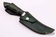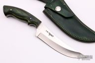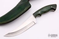 This Hunter by Terrell Pickett features a satin finished clip point blade with notched thumbrest, .146" blade stock and 1.423" blade depth, full tang construction. The handle has green dymondwood scales with white liners. Comes with a green leather sheath. Excellent condition.