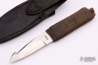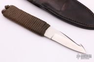This Guthook by John Greco features a satin finished blade with guthook, .161" blade stock, .996" blade depth, full tang construction with a od green cord wrapped handle. Comes with a black leather sheath. Has some scratches, otherwise good condition.