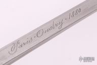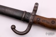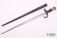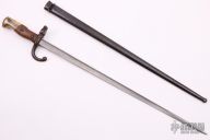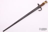 This bayonet was the last of the French "sword-type" bayonets. It was manufactured to fit the French Model 1874 "Gras" Infantry Rifle, basically a refinement of the Model 1866 Chassepot Infantry Rifle. The "Gras" was manufactured from 1874 to about 1885. This bayonet has a solid brass pommel with integral latching mechanism. Grips are wood. Crossguard is steel, usually "blued" with upper guard being the muzzel-ring, lower guard forming a hooked "blade-breaker" quillon. Blades are steel and triangular in form. The blades are usually marked on the back edge with the arsenal, month and year of manufacture. This one is marked "Paris Oudry 1880".