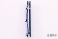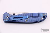 This Custom Firetac by Rick Hinderer features a satin finished drop point blade with swedge, dual thumb studs and notched thumb ramp. The handle is comprised of a textured blue twill G-10 scale over tumbled and anodized titanium liner and an anodized and machined titanium lockside. Anodized titanium clip can be positioned for tip up and tip down carry. Matching filler tab. Includes original box. Excellent condition.