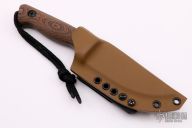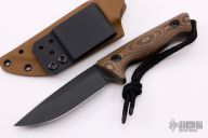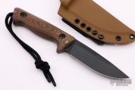 This Recon Hunter by Treeman Knives has a black drop point blade with a false top edge and notched thumbrest. The blade is 57/58 Rc and vacuum heat treated in a state of the art furnace, .192" blade stock and 1.242" blade depth, full tang construction. It will out cut and hold an edge as good as or better than any knife made. The scales are brown/green canvas micarta. Comes with a kydex sheath. Excellent condition.