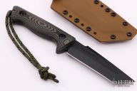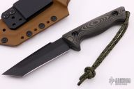 This Recon Phalanx by Treeman Knives has a black tanto blade with a false top edge and notched thumbrest. The blade is 57/58 Rc and vacuum heat treated in a state-of-the-art furnace, .192" blade stock and 1.307" blade depth, full tang construction. It will out cut and hold an edge as good as or better than any knife made. The scales are black/green G-10. Comes with a kydex sheath. Excellent condition.