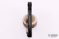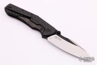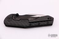 This knife by Zero Tolerance is a Sinkevich/Rexford Design, it features a two-tone CPM 20CV blade with black flats and satin grinds, notched thumbrest and thumb lug. The handle has a black carbon fiber frame with a black titanium lockbar and tip up clip, bead blasted and darked titanium backspacer. Comes with original box and papers. S/0101. Excellent condition.