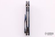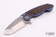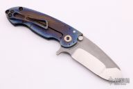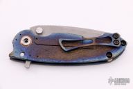 This Solo Flipper by Direware features a two-tone multi-ground blade with notched thumbrest and a flipper. The handle has a fully textured and anodized titanium frame and tip up titanium clip, textured titanium pivot and copper pivot collars, titanium barrel spacers. Comes with original box. Rides on bearings, nice detent, lockup and blade seating. Excellent condition.