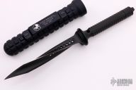 This Jagdkommando by Microtech features a black finished integral blade and handle. Comes with black aluminum tube sheath. Serial Number 1451 and dated 09/2019. Excellent condition. Comes with original box.