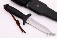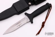 This is a Gerber/BenchMark TAC I Military Survival Knife with the locking sheath. The blade is double-edged and double serrated. Blade is .148" thick and 1.129" in depth. Blackie Collins is the designer. The handles on TAC Is are molded Zytel, full-hidden-tang. Comes with original locking sheath and box. Serial #A02301. Excellent condition. First Production Run 1985
