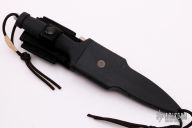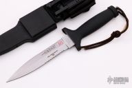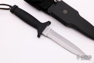 This is a Gerber TAC II Military Survival Knife with the locking sheath. The blade is double-edged and double serrated. Blade is .149" thick and 1.139" in depth. Blackie Collins is the designer. The handles on TAC IIs are molded Zytel, full-hidden-tang. Comes with original locking sheath, box and papers. Serial #A03765. Excellent condition.