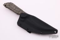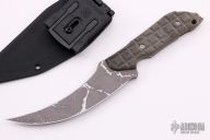 This Rhino XL by Steve Ryan features a splatter finished upswept chisel ground blade with a sharpened and serrated top edge and notched thumbrest, .140" blade stock and 1.616" blade depth, full tang construction with frag pattern black canvas micarta scales. Comes with a kydex sheath. Excellent condition.