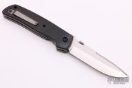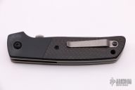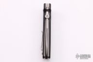 This ATCF by Bob Terzuola features a tumble finished spear point style blade with notched thumbrest and a thumbdisc. The handle has synthetic bolsters, carbon fiber scales, blasted titanium liners, carbon fiber backspacer, tip up blasted titanium clip.  Titanium tip up pocket clip. The blade is slightly off center otherwise the knife is in excellent condition.