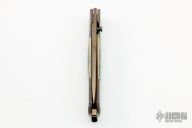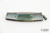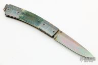 This knife by Jukka Hankala features a colored Damascus blade with single fileworked thumbstud. The handle has dovetailed and colored mosaic Damascus bolsters, green mammoth ivory scales, anodized titanium liners, fileworked copper backspacer, mosaic Damascus lanyard bail. Nice detent and lockup. Comes with zippered case and a note from the maker. Has some light scratches, otherwise excellent condition. Comes with COA dated 10/2/2006