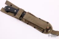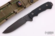 This FieldTac 5.5 by Hinderer Knives features a black finished blade with notched thumbrest, .227" blade stock and 1.358" blade depth, full tang construction. The handle has textured Green G-10 scales. Comes with a black SpecOps brand sheath and a padded zippered case. Excellent condition.