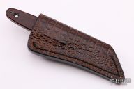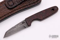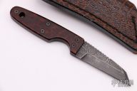 This knife features a wharncliffe Damascus blade with a notched thumb rest and full tang construction.  .107" Blade Stock.  .790" Blade Depth.  The handle features snake wood scales.  Includes an alligator leather sheath.  Marked MP on the blade.  Please let us know if you can identify the maker.  Excellent condition.