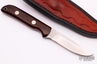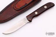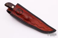 This knife by Albert Trujillo features a satin finished blade with fileworked spine, .118" blade stock and .795" blade depth, full tapered tang construction. The handle has ironwood scales with red liners and brass lanyard hole, has fileworked tang with red epoxy fill. Comes with a hand tooled brown/black leather sheath. Has some light scratches, otherwise excellent condition.