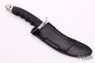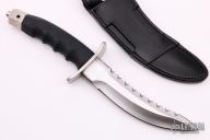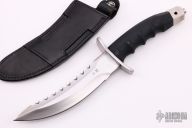 This Warrior from Al Mar Knives features a satin finished blade with serrated top edge, .233" blade stock and 1.476" blade depth, hidden tang construction. The handle has a stainless steel double guard, black rubberized handle, and a stainless steel butt. Comes with a black leather sheath, original box and papers. Excellent Condition.
