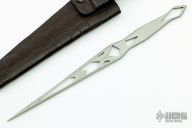 This Skelletto by Robert Williams features a satin finished skeletonized blade and handle, .188" blade stock and .819" blade depth, full tang construction. Comes with a brown leather covered kydex sheath. Has some sheath marks, otherwise excellent condition. Comes with a zippered case. This knife is new old stock from another dealer.