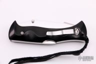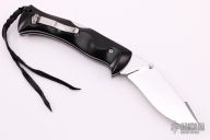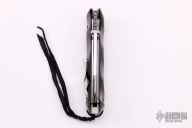 This Phobos Lockback folder by Citadel Knives features a mirror polished kukri shaped blade with dual thumbstuds and notched thumbrest. The handle has black linen micarta scales, polished stainless steel liners and backspacer with lanyard hole. Nice detent, lockup and blade seating. Comes with zippered case. Excellent condition. New old stock from another dealer.