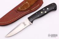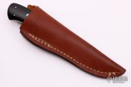 This knife by Russell Easler features a hand rub satin finished blade with a false top edge, .131" blade stock and .941" blade depth, full tang construction. The handle has buffalo horn scales with 4 abalone inlays on each side. Comes with a brown leather sheath. Has some scratches on the horn, otherwise excellent condition.