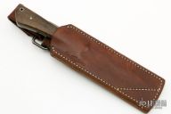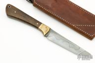 This knife by Craig Falls features a hand rub satin finished blade with nice hamon, .175" blade stock and .863" blade depth, full tang construction. The handle has bronze bolsters and wood scales with black G-10 liners, has lanyard hole. Comes with a brown leather sheath with belt loop. New from maker. The tang and the bolsters have been blued and antiqued.