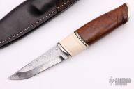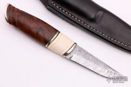 This knife by Marcus Doyle features a Damasteel blade with a hidden tang construction.  .175" Blade Stock.  .954" Blade Depth.  The handle has a nickel silver guard and butt, a fluted Desert iron grip and ivory spacers.  Comes with a brown leather sheath. New from maker.