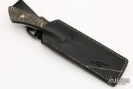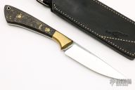 This SK4 #6 by Craig Falls features a mirror finished blade with textured flats, .153" blade stock and .935" blade depth, full tang construction. The handle has bronze bolsters and bronze carbon fiber scales, has lanyard hole. Comes with a black leather sheath with belt loop. New from maker. Comes with a COA dated 11-19.