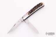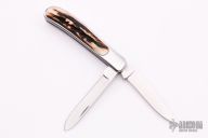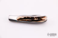 This Interframe Trapper Slipjoint by Chuck Stewart features hand rub satin finished blades with nail nicks. The handle is comprised of stainless steel covers with stag inlays, stainless steel liners and springs. Has half-stops. Has some light scratches, otherwise excellent condition. Includes leather pouch and a zippered case. "W132" on blade.