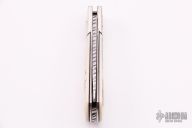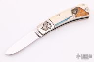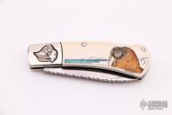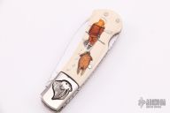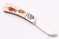 This lockback by Tommy Lee features a mirror finished blade with fileworked spine. The handle has engraved and dovetailed nickel silver bolsters signed "MEL", walrus ivory scales with black liners that have been scrimshawed by "Burdette", stainless steel liners and fileworked backspacer. Comes with a zippered case. Has some light scratches, otherwise excellent condition.