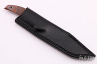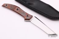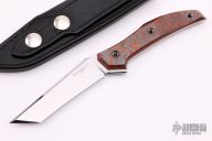 This Lares Fixed Blade by Stefano Compostella features a two-tone blade with beautiful hand rub satin finish on the grinds and mirror polished swedge and tanto edge, .119" blade stock and 1.090" blade depth, full tang construction. The handle has fat carbon scales with hollow pins and red liners. Comes with a black leather sheath and zippered case. New from maker. Comes with COA dated 09-2020.