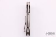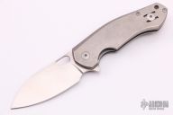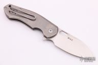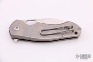 This AICE BIBLIO by Giant Mouse features a satin finished drop point blade with thumb hole and notched thumb rest. The handle is comprised of a tumbled titanium frame with a stainless tip up pocket clip. Has some scratches, otherwise good condition.