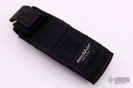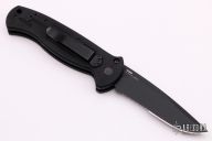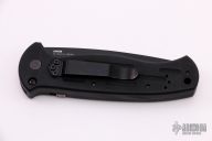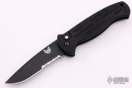 This 9052 AFO auto has a black blade with partially serrated edge. Black anodized aluminum handle. Integrated safety system. Black stainless steel clip - up or down reversible, and lanyard hole. Has some scuffs on the frame, otherwise good condition. Comes with nylon sheath and Benchmade box.