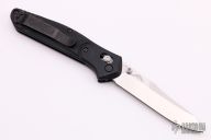 This 940-2 Osborne Axis Lock Folder from Benchmade has a satin S30V clip point blade with false top edge and dual thumbstuds. Handle has black G-10 scales with stainless steel internal liners, anodized aluminum barrel spacers, and black finished stainless steel tip up clip (RH/LH Reversible). Dead center blade seating and excellent lockup. Excellent condition. Comes with original box and papers.