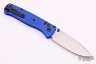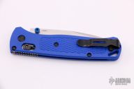 The 535 Bugout knife is built with a blue Grivory handle and a satin finished blade with a plain cutting edge.