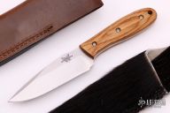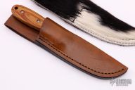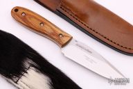 This 180 Outbounder from Benchmade is a McHenry & Williams design. It features a tumble finished drop point blade with swedge and notched thumbrest. The handle is comprised of wood scales over full tapered tang construction. Lanyard hole in pommel. Includes leather sheath with belt loop. Comes with an additional custom leather sheath with some kind of fur. Excellent condition. This knife is discontinued and no longer in productions. Limited Edition #391/500