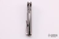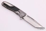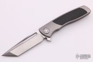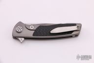 This Micro Evo Typhoon Mid-tech from Brian Nadeau features a satin finished tanto style blade with a fuller and notched thumbrest. The handle is comprised of a bead blasted titanium frame with carbon fiber inlays, satin titanium tip up clip. Rides on bearings, nice detent, lockup and blade seating, stainless lockface insert. Includes original box. Excellent condition.