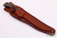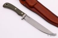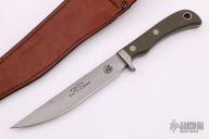 This Magnum Boar Hunter from Knives of Alaska features a bead blasted blade with a notched thumbrest, .129" blade stock and 1.029" blade depth, full tang construction. The handle is comprised of a stainless steel guard with green G-10 scales with nickel silver pins and a lanyard hole. Includes leather sheath. Excellent condition.