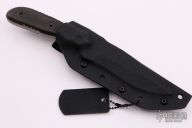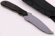 Fire Hawke is a compact knife with a full tang blade made of grey-coated 1095 High Carbon Steel, .190" blade stock and 1.145" blade depth. The handle with handle scales made of dark-red highlighted black textured G10 with white liners. Blade back, thumb ramp and a finger hollow for the index finger. Model Fire Hawke will be delivered with Kydex sheath with rotatable metal belt clip. Excellent condition.