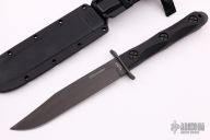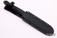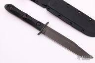 The Ek Model 5 Bowie fighter is part of the John Ek Commando lineup from Ka-Bar. It features 1095 Cro-Van high carbon steel with a black parkerized finish. The handle is outfitted with textured glass-filled nylon scale and traditional X-head fasteners. A US-made Celcon® sheath with retaining strap, self-locking function and multiple tie-down points is also included. Made in the USA. Excellent condition. Comes with original box, sheath and papers.