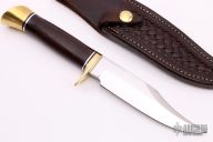 This knife by the famed maker Harvey Draper, features a high polished blade with a nearly sharpened top edge, .237" blade stock and 1.225" blade depth, hidden tang construction. The handle has a brass guard and butt with a dark walnut grip and aluminum and black spacers. Comes with hand tooled brown leather sheath. Has some light scratches, otherwise excellent condition.