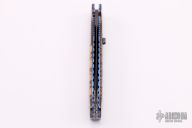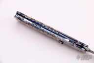 This Small Symmetrical Auto Dagger by Larry Newton features a hot blued Vegas Forge Damascus blade with 10 14kt gold dot inlays. The handle has matching hot bled Damascus bolsters front and rear with 24kt gold inlays, engraved rocker bar with checkered 24kt gold button and 24kt gold inlays, beautiful tiger coral scales, handmade and engraved clocked screws, anodized and fileworked titanium liners, engraved stainless steel backspacer inside and out. Makers mark is engraved inside the backspacer as well. Nice smooth action, lockup and blade seating. Comes with a zippered case. New from maker. This knife is stunning and perfect in every way. Don't miss out on this one.
