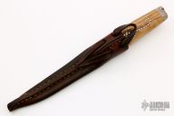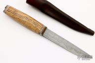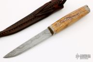 This Neck Knife by Paul Cooper features a Damascus blade (Damascus by Master Smith Zack Jonas) with .168" blade stock and .720" blade depth, hidden tang construction. The handle has an olive wood grip with stainless steel pin inlays and stag guard and butt. Comes with a brown leather sheath with loop for neck carry. New from maker.