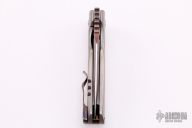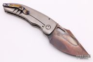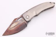 This LB by Sean O'Connell features a temper finished blade with notched thumbrest and thumbhole. The handle has an orange peel finished titanium frame with timascus tip up clip and backspacer, anodized titanium pivot collars. Nice detent, lockup and blade seating. Rides on bearings. Comes with a zippered case and COA dated 12/4/19. Has a couple light scratches, otherwise excellent condition. Comes with a zippered case.