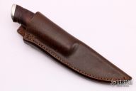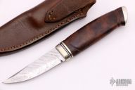 This knife by Marcus Doyle features a Damasteel blade with .119" blade stock and .866" blade depth, hidden tang construction. The handle has a nickel silver guard and butt, ironwood  grip with black spacers. Comes with a brown leather sheath. New from maker.