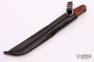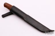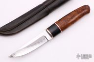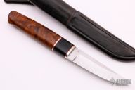 This knife by Marcus Doyle features a Michael West blade with .155" blade stock and .988" blade depth, hidden tang construction. The handle has a nickel silver guard, desert ironwood grip and a African Blackwood spacer. Comes with a black leather sheath. New from maker.