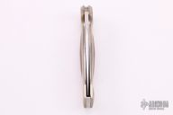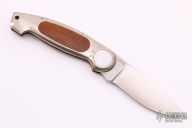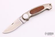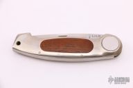 This Button Lock Folder from Jimmy Lile features a satin finished blade with nail nick. The handle has a nickel silver frame with wood inlays. Large button lock release mechanism used to open and close the knife. Numbered "187s" on back side of blade. Has some light scratches and patina, otherwise excellent condition.