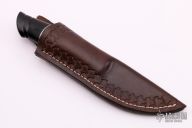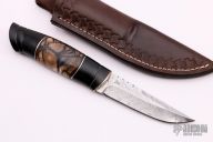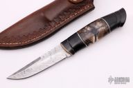 This knife by Marcus Doyle features an Ingemar Nordell Damasteel blade with fileworked spine, .159" blade stock and .968" blade depth, hidden tang construction. The handle has a nickel silver guard, a fluted Buffalo Horn and Cross-Cut Mammoth grip. Comes with a brown leather sheath. New from maker.