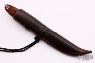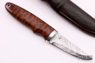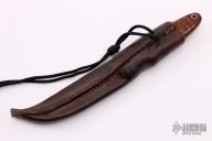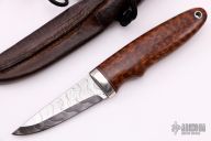This knife by Marcus Doyle features a Damasteel blade with .118" blade stock and .875" blade depth, hidden tang construction. The handle has a nickel silver guard, Snake wood grip and black/red/black spacer pattern. Comes with a brown leather sheath. New from maker.