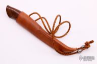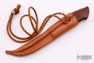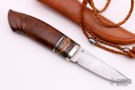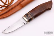 This knife by Marcus Doyle features a Soren Stormgaard Damascus blade with .157" blade stock and 1.023" blade depth, hidden tang construction. The handle has a nickel silver guard with a Mammoth molar and Desert Ironwood grip.  Comes with a brown leather sheath. New from maker.