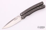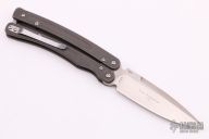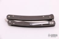 This Mayhem Balisong by Bradley Cutlery features a tumble finished spear point blade with swedge and notched thumb rest. The handle is comprised of blasted titanium over blue anodized aluminum barrel spacers. The stainless steel pocket clip is positioned for tip up carry. Steel T latch on pommel. Has some scuffs/scratches on the frame, otherwise good condition. Includes original drawstring pouch and box and papers. FPR #172