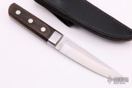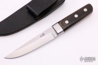 This is a vintage Al Mar Model 4003 has laminated wood scales, integral bolster and full tang construction. Satin finished blade with notching on thumbrest, .119" blade stock and 1.11" blade depth. Comes with black leather sheath. Has some light scratches, otherwise excellent condition.